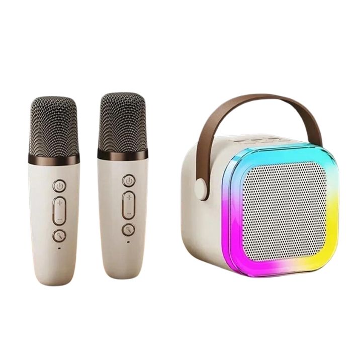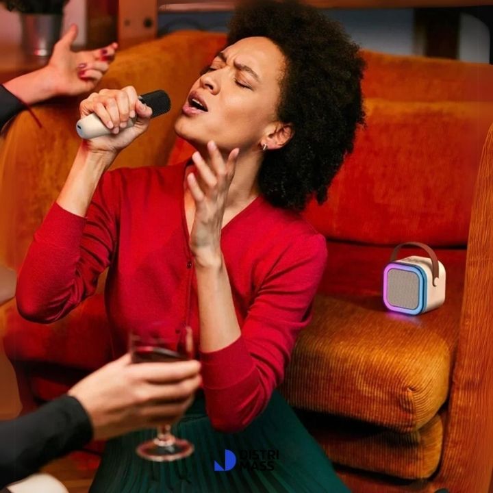 Este Mini Parlante Bluetooth con dos micrófonos inalámbricos es perfecto para karaoke, fiestas y reuniones con amigos. Se conecta fácilmente con cualquier dispositivo por Bluetooth, reproduce desde tarjetas micro SD y sintoniza radio FM. Además, tiene una agarradera práctica para llevarlo a donde quieras, y unas increíbles luces LED en el borde que le darán un toque especial a cualquier ambiente.