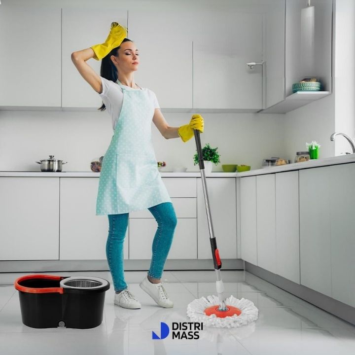 - Arma el trapeador: Coloca el cabezal giratorio y ajusta el palo a la altura deseada.